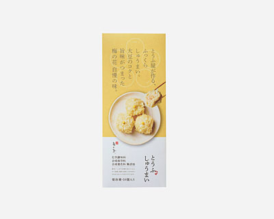 しぼり豆腐に海老、玉葱、九州産銘柄鶏の 華味鳥を加えた名物のとうふしゅうまいです。
