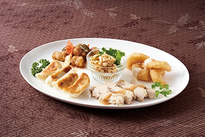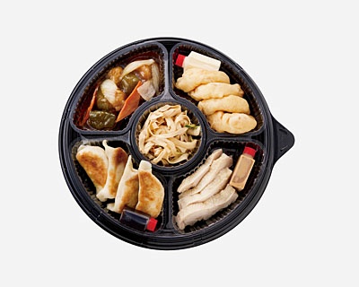 <内容>棒棒鶏(タレ付)、酢豚、焼餃子(酢醤油付)、 エビマヨ(マヨソース付)、干豆腐のサラダ