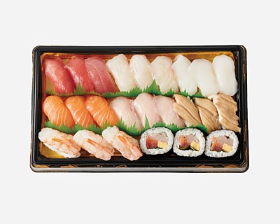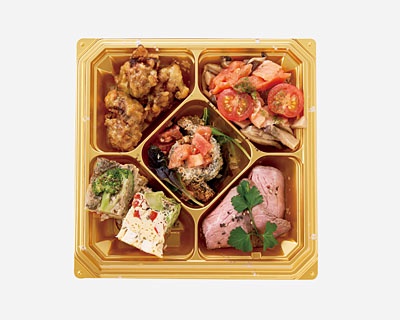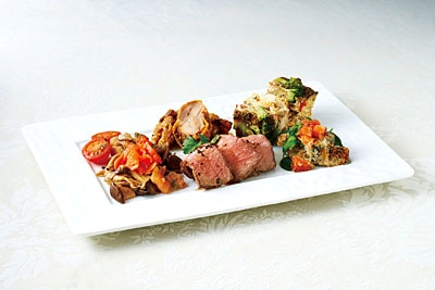 <内容>国産牛のローストビーフ、イワシのハーブパン粉焼き、 ハニーマスタードフライドチキン、きのことスモークサーモンの マリネ、ノンオイルスパニッシュオムレツ