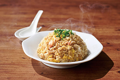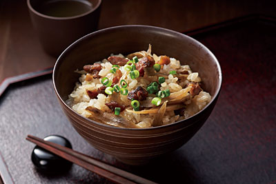 麦ごはん、季節の唐揚げ、射込み煮、ひじき煮入り玉子焼き、大根煮など