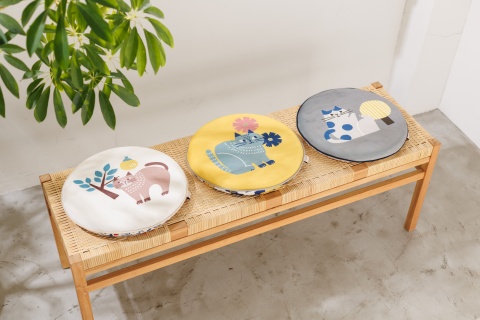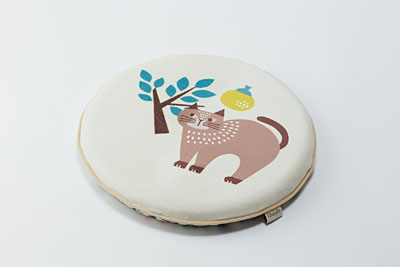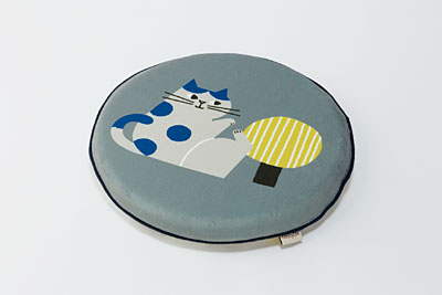かわいいネコのイラストとアクセントカラーの両面デザイン。座布団、ソファーの背もたれなどに。